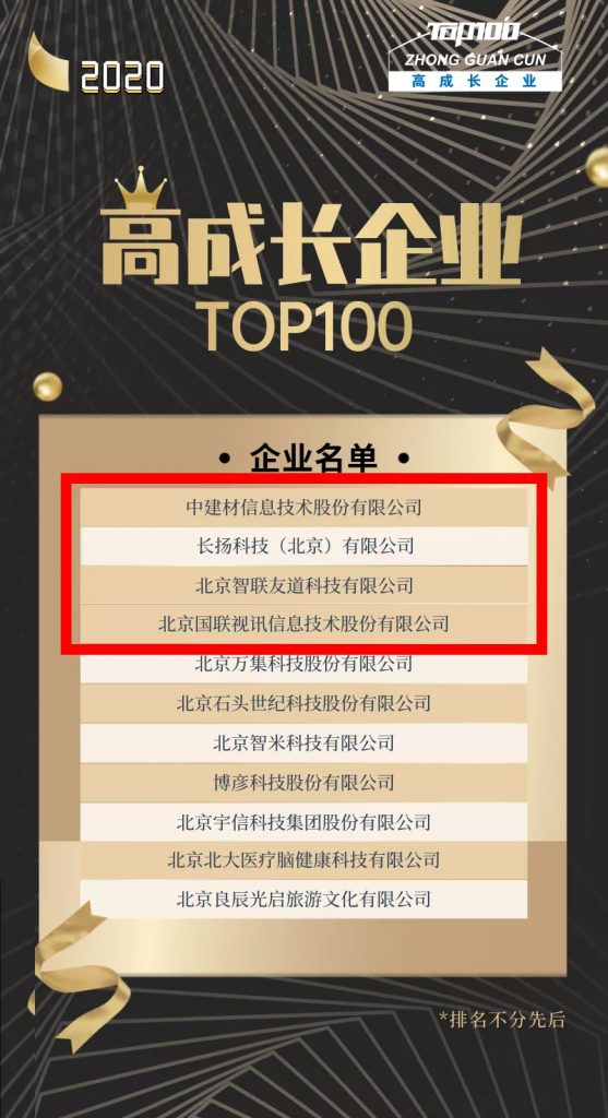 高成长企业TOP100是中关村地区标志性活动之一,历届活动得到了北京市科委、中关村管委会、中关村科学城管委会等的指导与支持。基石基金本次有四家企业登上高成长企业TOP100榜单。中建材信息技术股份有限公司(以下简称“中建信息”)、长扬科技(北京)有限公司(以下简称“长扬科技”)、北京智联友道科技有限公司(以下简称“智联友道”)、北京国联视讯信息技术股份有限公司(以下简称:”国联股份”)。